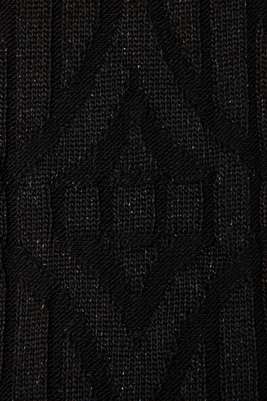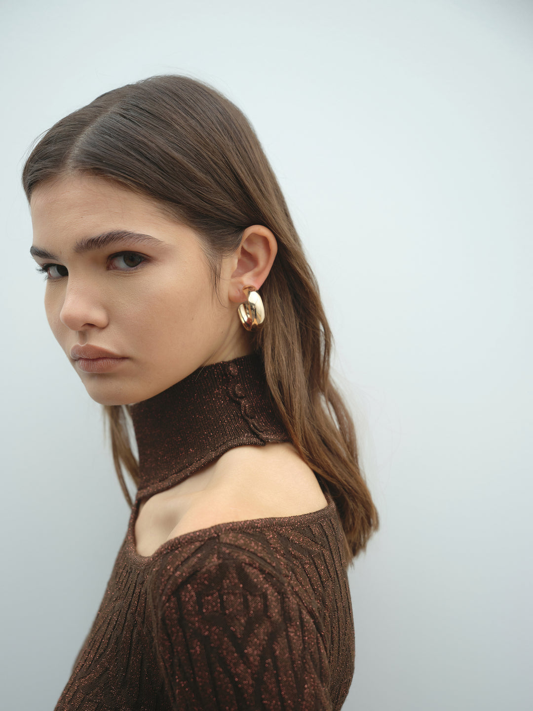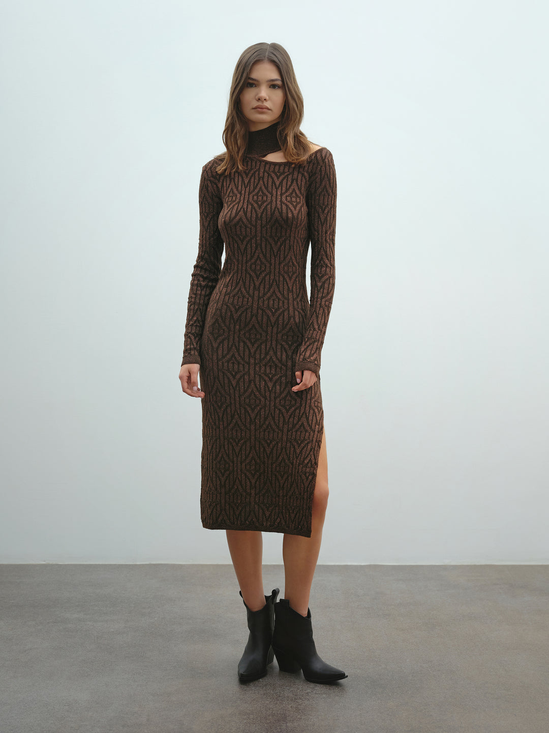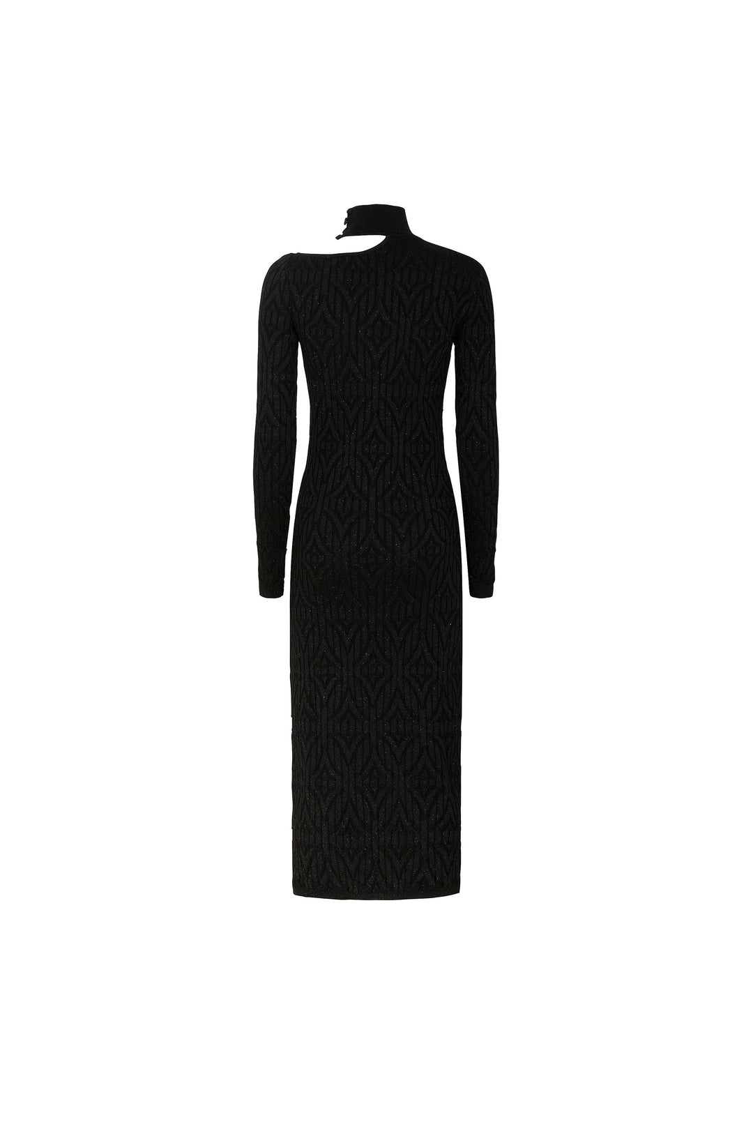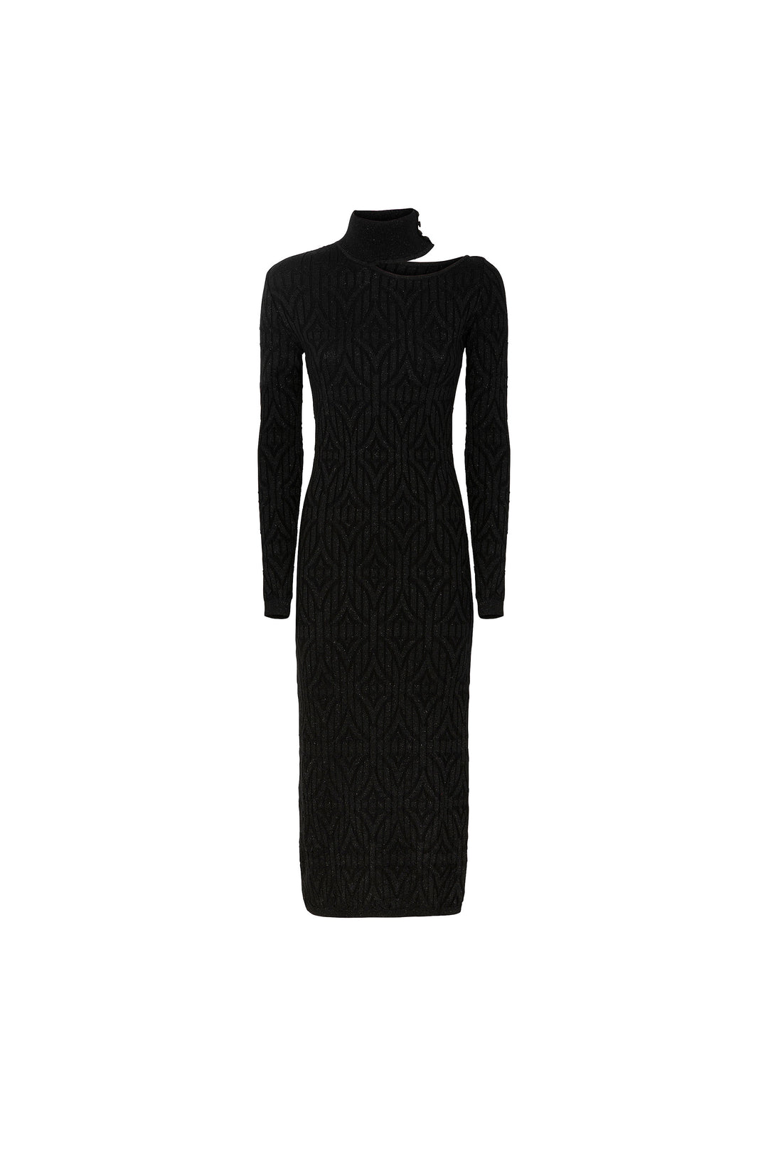 Abito lungo in maglia a costine impreziosito da un elegante logo in filato lurex che dona luminosità e carattere al look. Il collo dolcevita avvolge con eleganza, mentre il cut-out su una spalla crea un gioco di contrasti tra minimalismo e sensualità. Un capo iconico, perfetto per l'inverno, da indossare con stivali alti per un outfit femminile, audace e sofisticato.