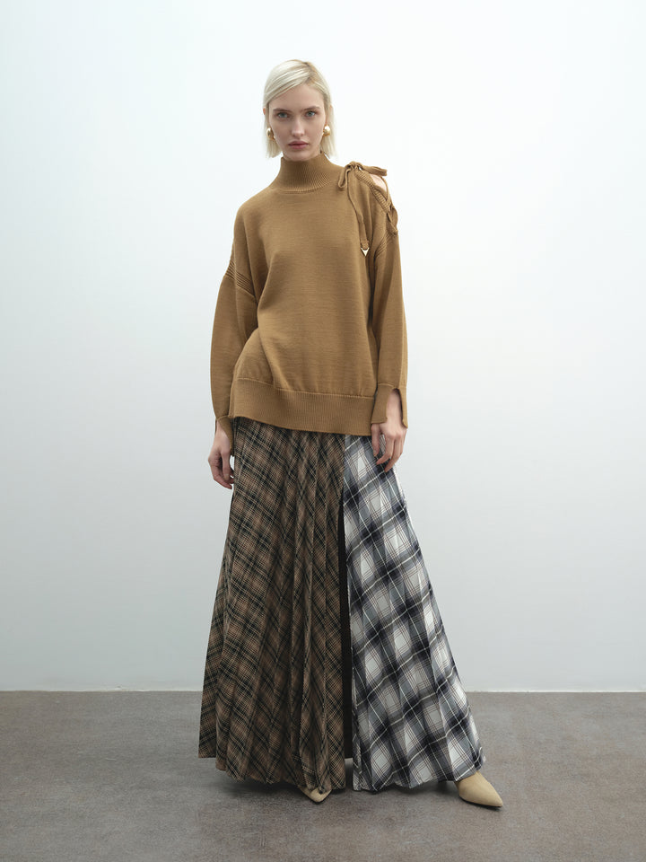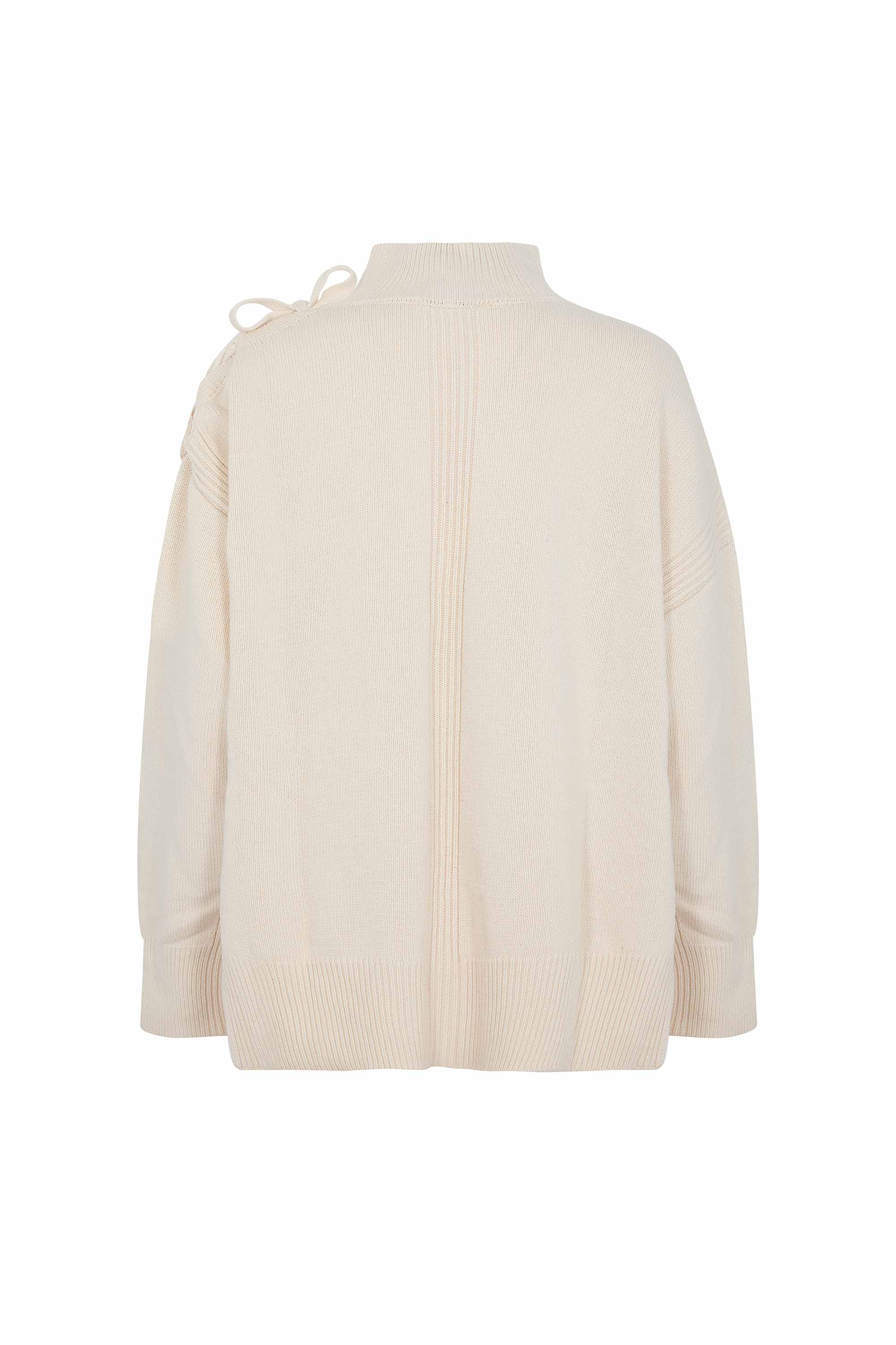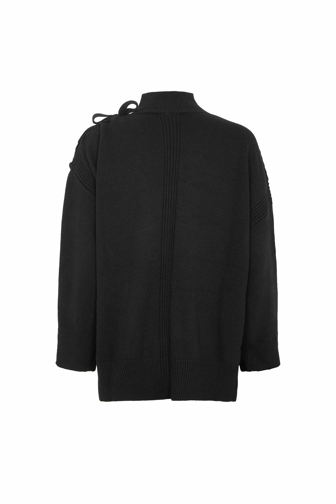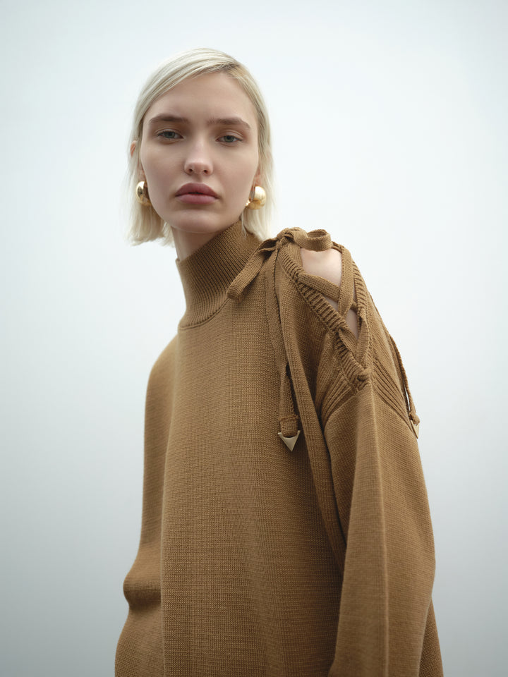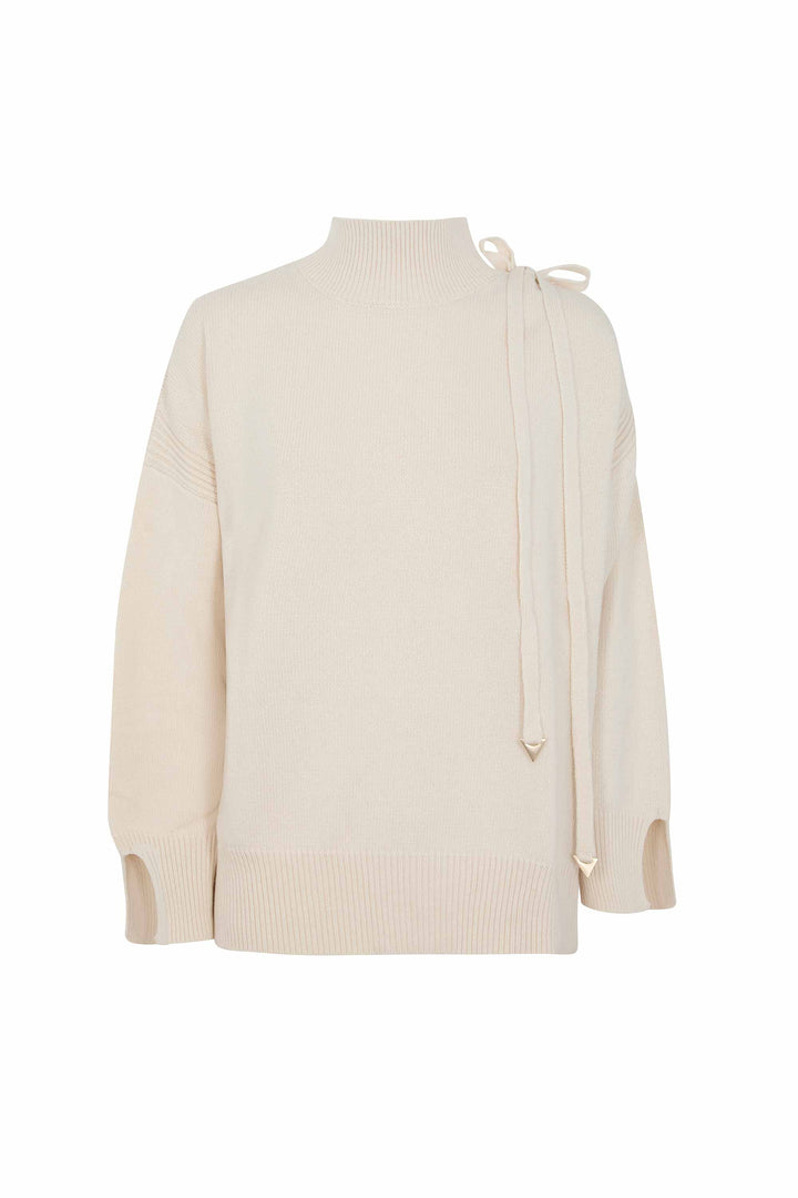 Maglione dolcevita con lacci intrecciati sulla spalla. Morbidezza e dettagli raffinati per un'eleganza senza tempo.