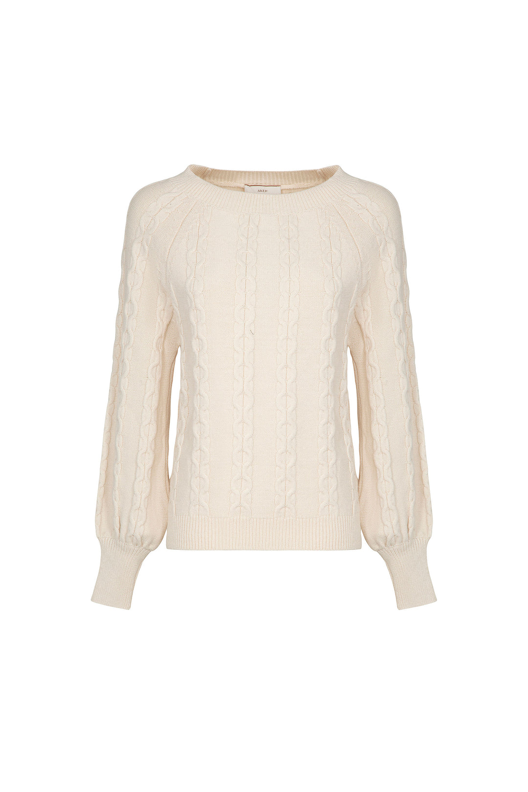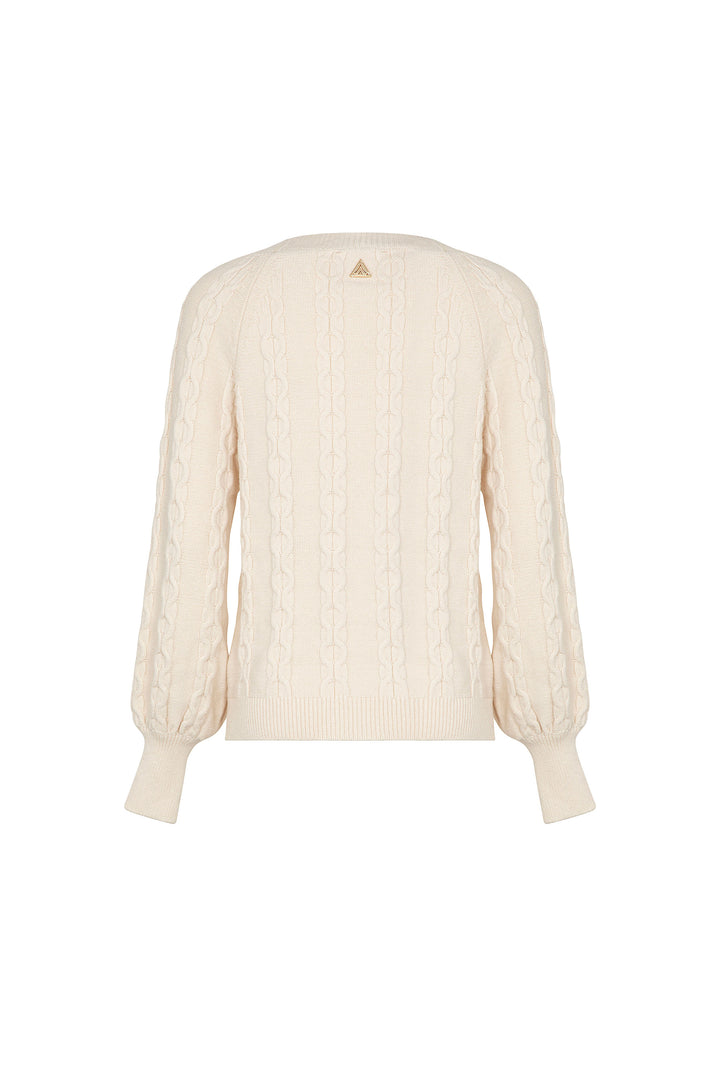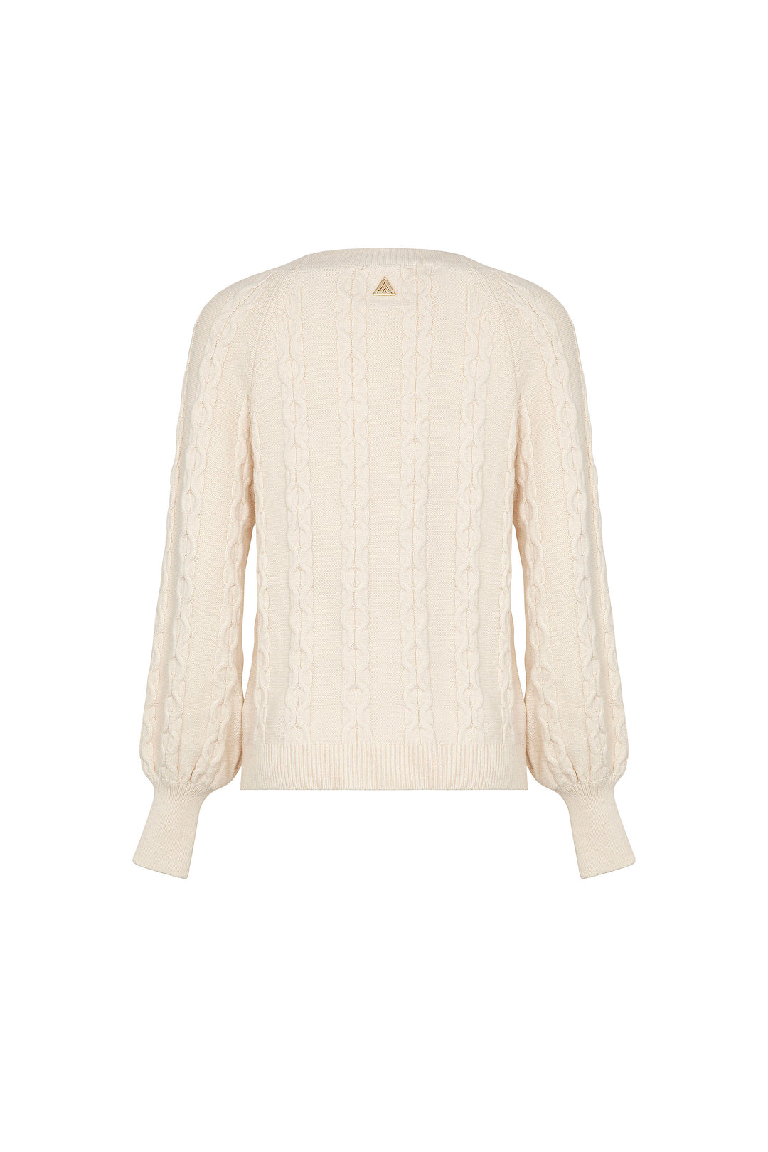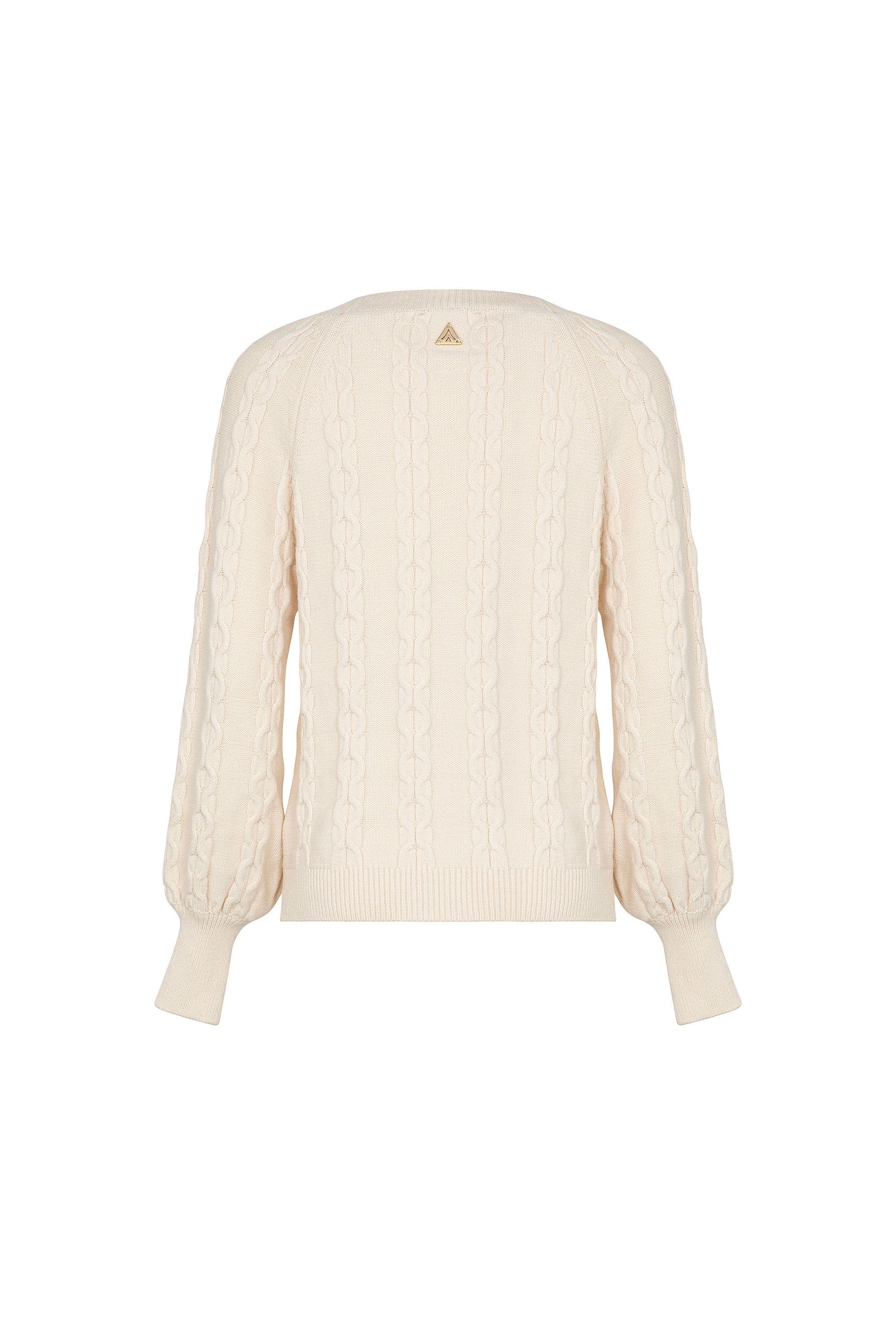 Maglia girocollo lavorata con motivo a trecce, maniche balloon e polsini alti a costine. Un pull caldo e sofisticato dalla vestibilità over, perfetto per la stagione invernale.