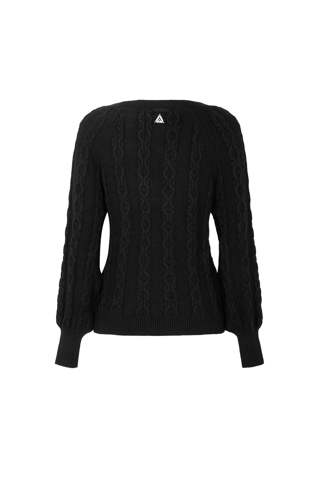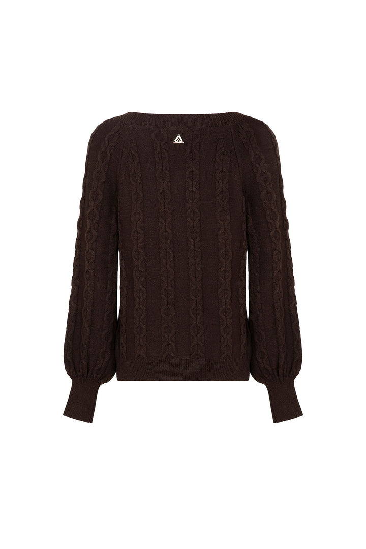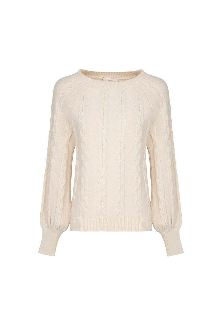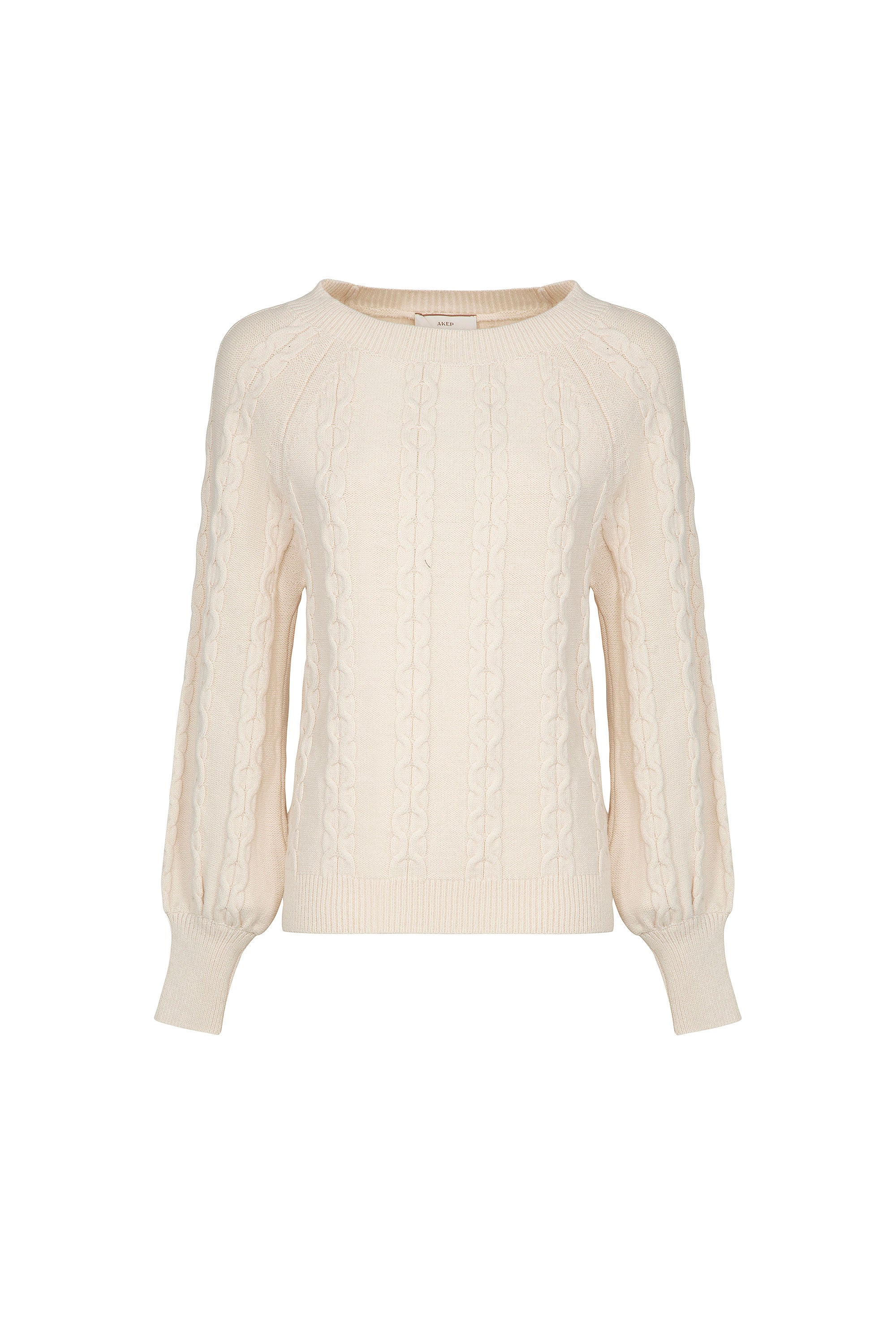 Maglia girocollo lavorata con motivo a trecce, maniche balloon e polsini alti a costine. Un pull caldo e sofisticato dalla vestibilità over, perfetto per la stagione invernale.