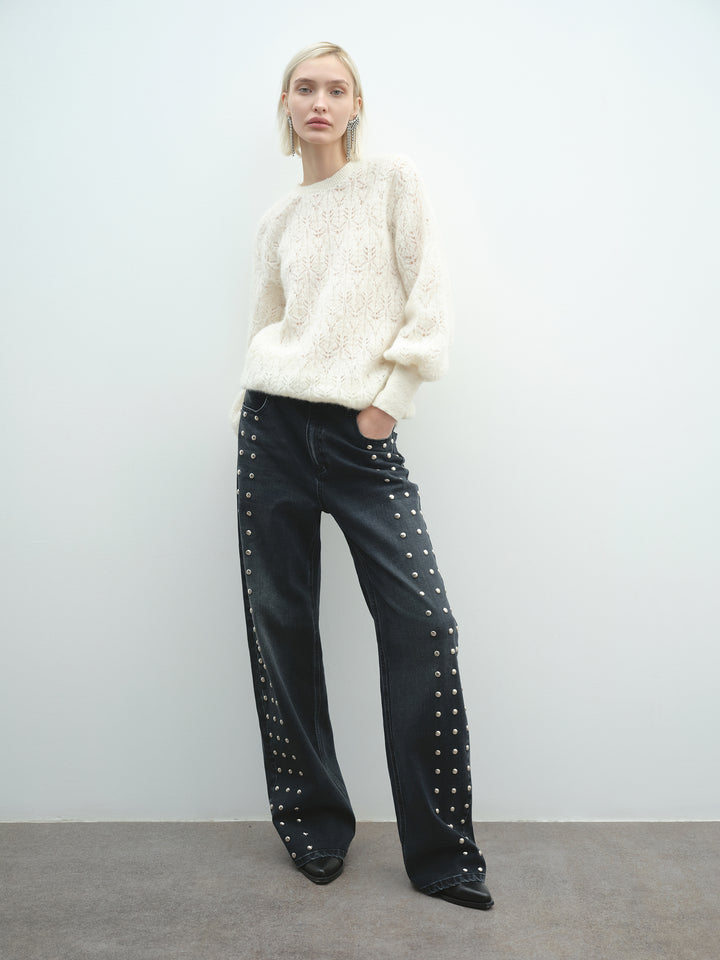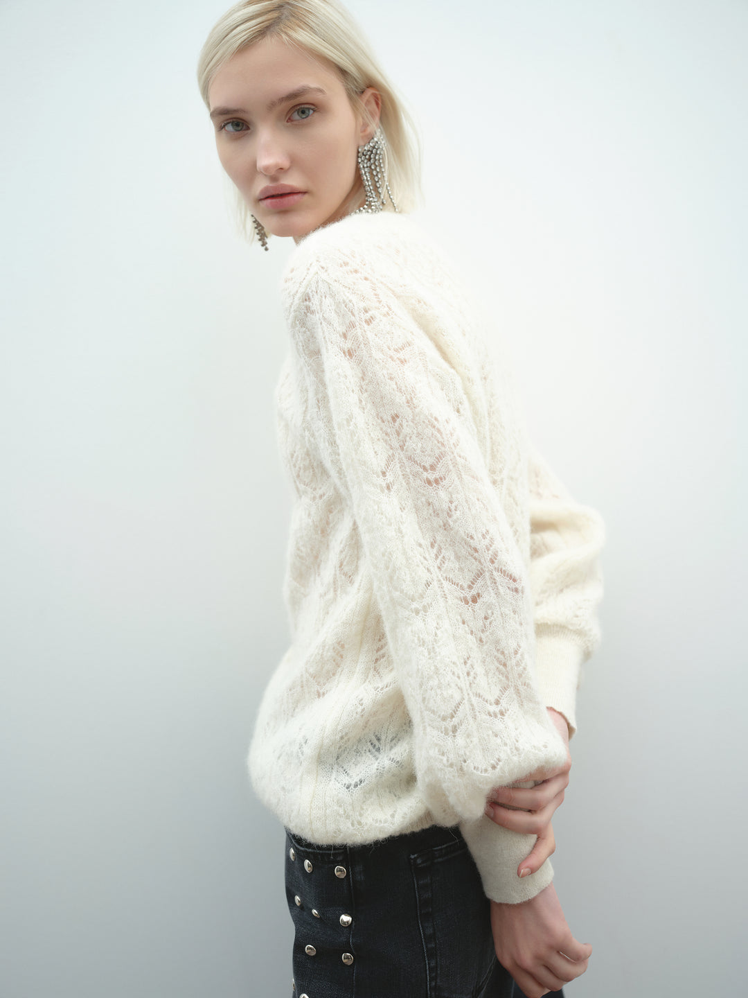 Pull girocollo in pregiata alpaca, con delicato motivo traforato. Morbido e caldo, un maglione elegante e avvolgente ideale per le giornate più fredde.