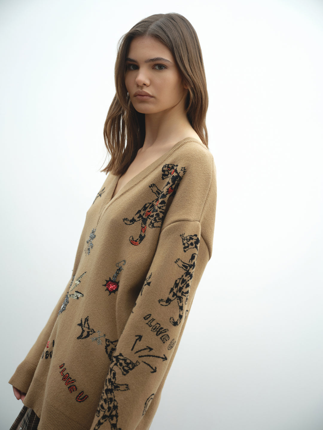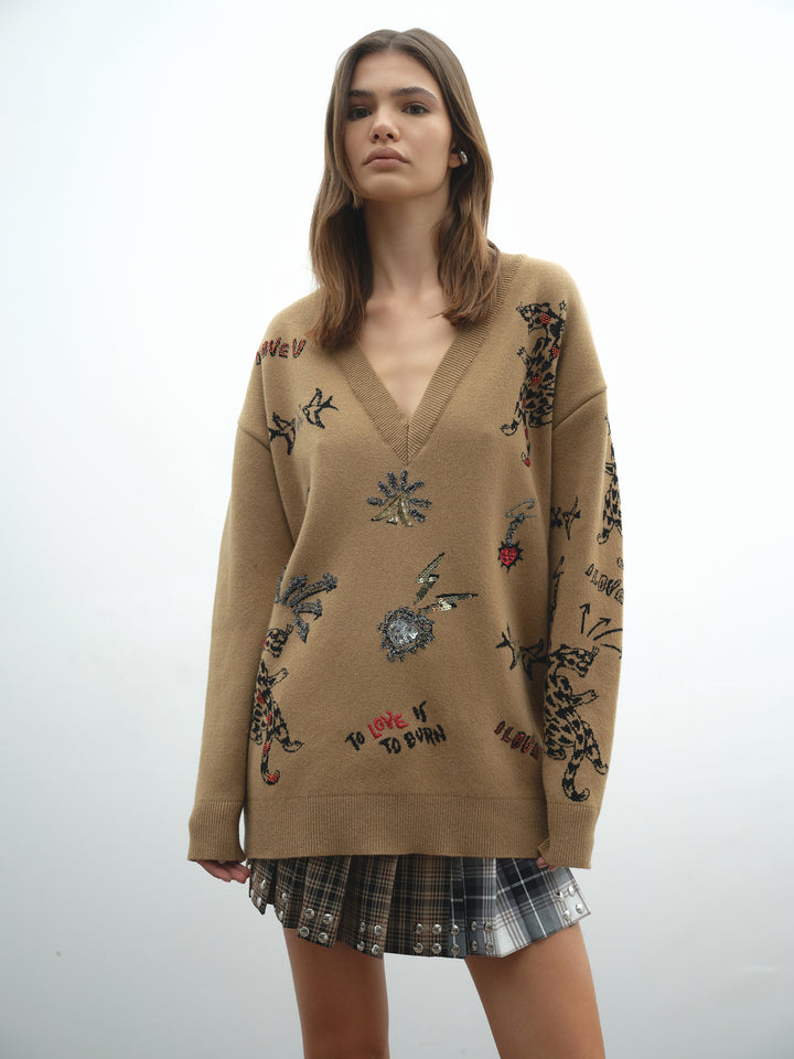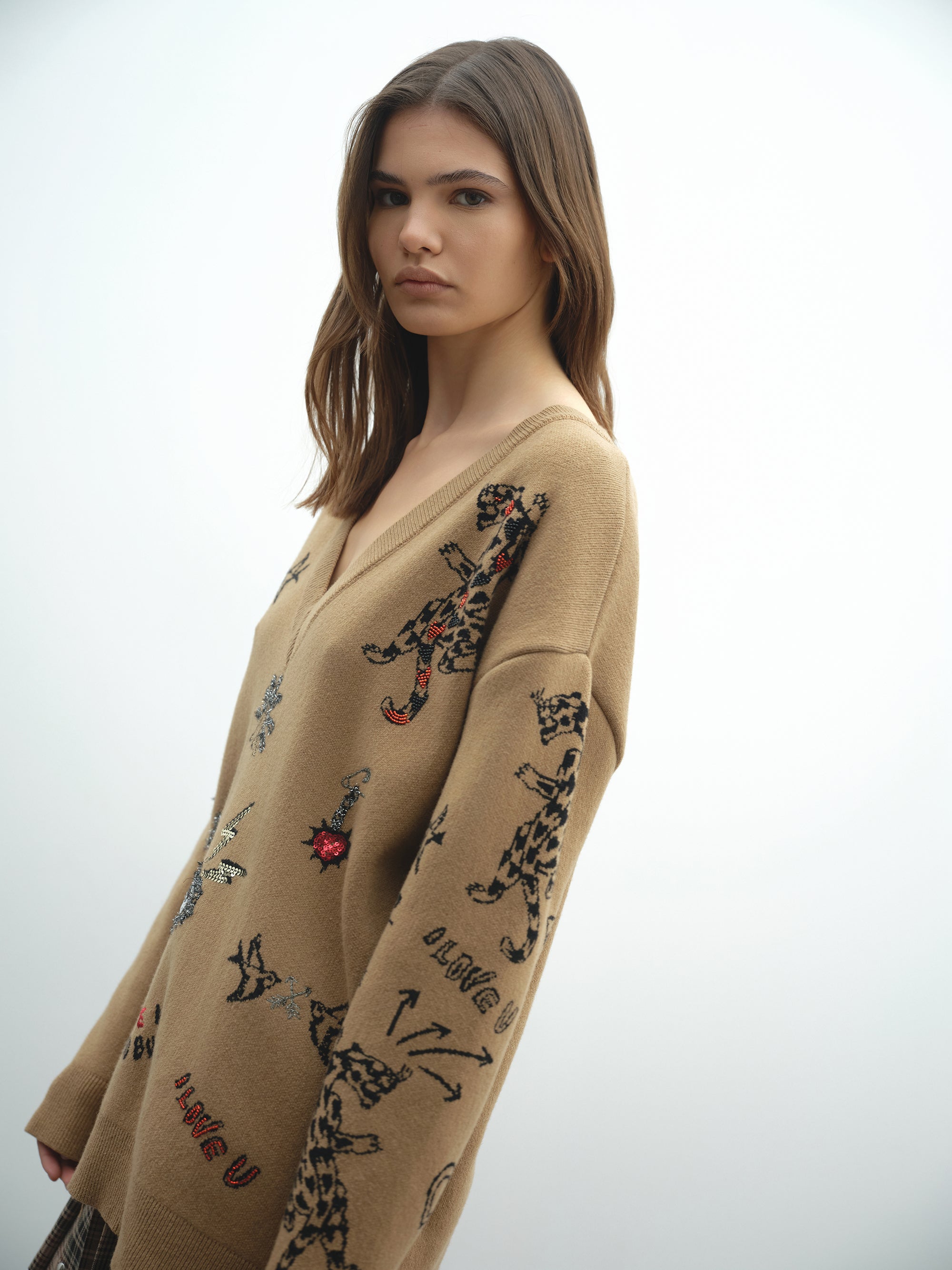 Maglia con scollo a V profondo, arricchita da ricami in paillettes che donano luce e carattere in pieno stile rock. Il taglio femminile si unisce a dettagli grintosi per un look audace e sofisticato. Ideale per chi ama distinguersi con stile, si abbina perfettamente a pantaloni in ecopelle, denim scuro o gonne midi per un outfit dal forte impatto visivo, perfetto sia di giorno che di sera.